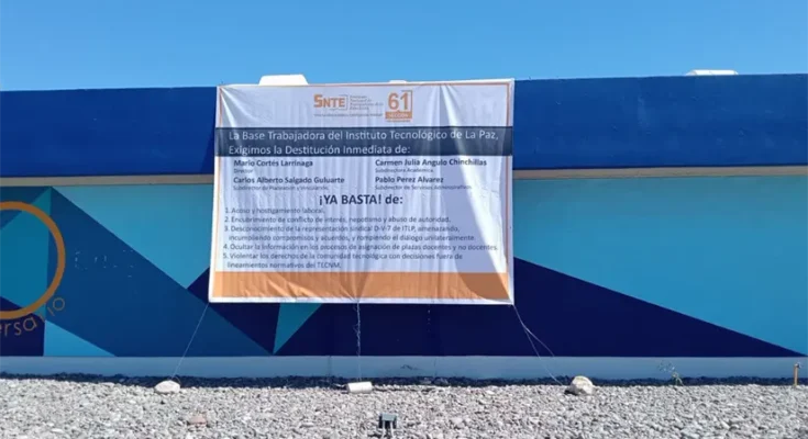 La tensión que se vive al interior del INSTITUTO TECNOLÓGICO DE LA PAZ ya escaló nuevos niveles, pues se registró otra manifestación ahora encabezada por la base trabajadora de ese plantel educativo, exigiendo la DESTITUCIÓN INMEDIATA del nefasto director y tres funcionarios de primer nivel, donde las acusaciones van desde acoso laboral en contra de 90 empleados hasta un presunto encubrimiento de CONFLICTO DE INTERÉS.