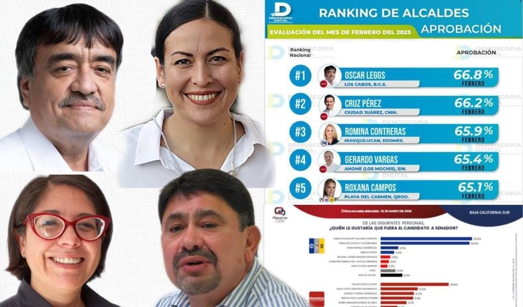 MIENTRAS la empresa DEMOSCOPIA DIGITAL da a conocer que OSCAR LEGGS CASTRO logra el 66.8 por ciento de aprobación ciudadana, colocándolo como el mejor alcalde del país durante el mes de febrero, la compañía MASSIVE CALLER también publica su encuesta sobre la intención del voto en el municipio de Los Cabos revela que MORENA observa el 43.1 por ciento, 23.9 por ciento para el PAN y 8.5 por ciento el PRI.