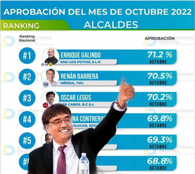 OTRA VEZ el presidente municipal de Los Cabos, OSCAR LEGGS CASTRO, vuelve a colocarse en el ranking nacional como el tercer alcalde con mayor aprobación ciudadana del país con el 70.2 por ciento, según revela la evaluación nacional que realizó la empresa DEMOSCOPIA DIGITAL.