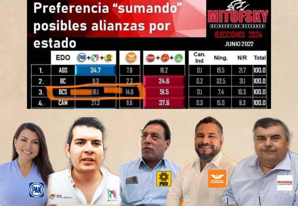 MITOFSKY revela en su encuesta de preferencias “Sumando posibles alianzas por estado” que en Baja California Sur la coalición donde convergen el Movimiento de Regeneración Nacional, Partido del Trabajo y Partido Verde Ecologista de México, se encuentra por encima del resto de las fuerzas políticas con un 51.5 por ciento.