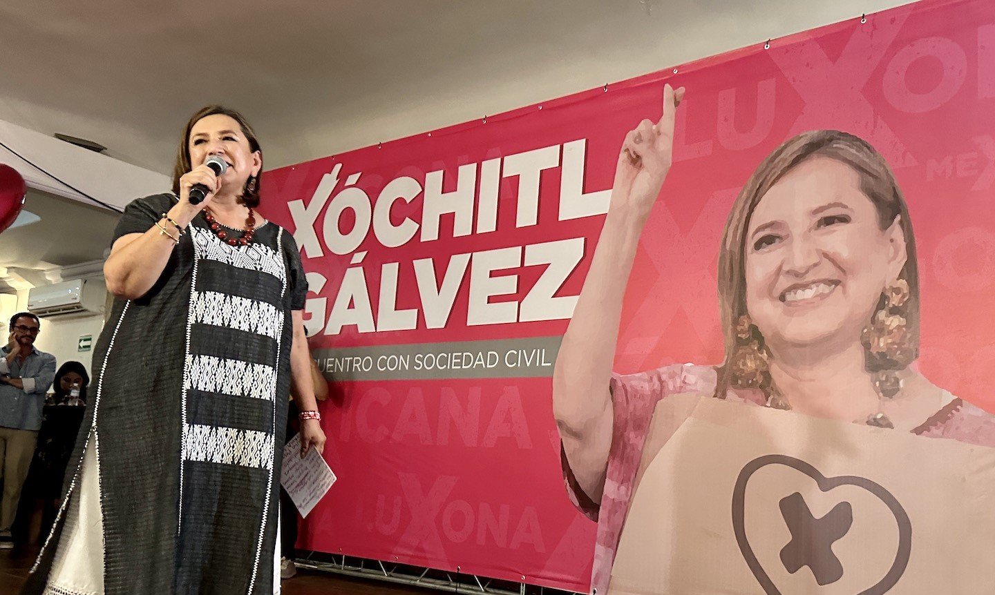 Once mujeres son asesinadas diariamente en el país, señala Gálvez. Y asegura que la inseguridad es el tema que más le comenta la gente del país. A un lado del escenario la observa el secretario general del PAN, Javier Bustos. Cuando Xóchitl hace pausa, se escuchan aplausos, gritos y matracas.