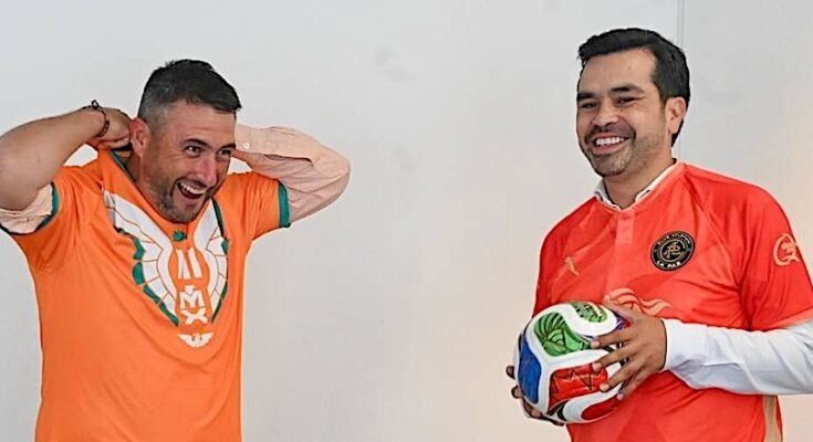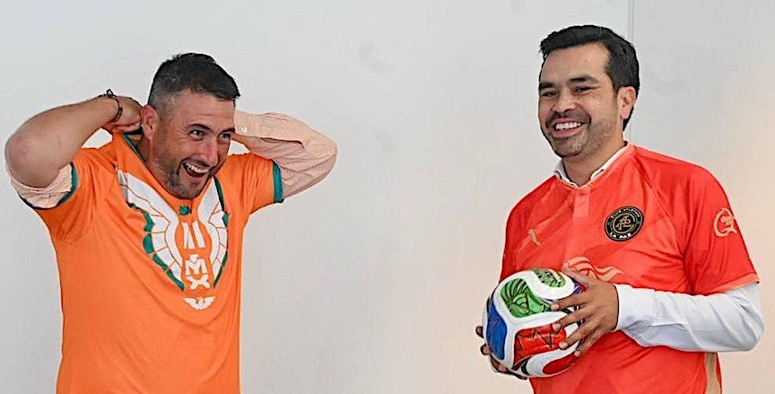 De nuevo aparece Ricardo Barroso junto al presidente nacional de Movimiento Ciudadano, Jorge Álvarez Máynez, intercambiando jerseys. El sudcaliforniano se enfundó el del Movimiento Naranja, con el águila blanca en el pecho y las letras MEX, mientras que el zacatecano se puso la casaca del Atlético La Paz, pero en color naranja.