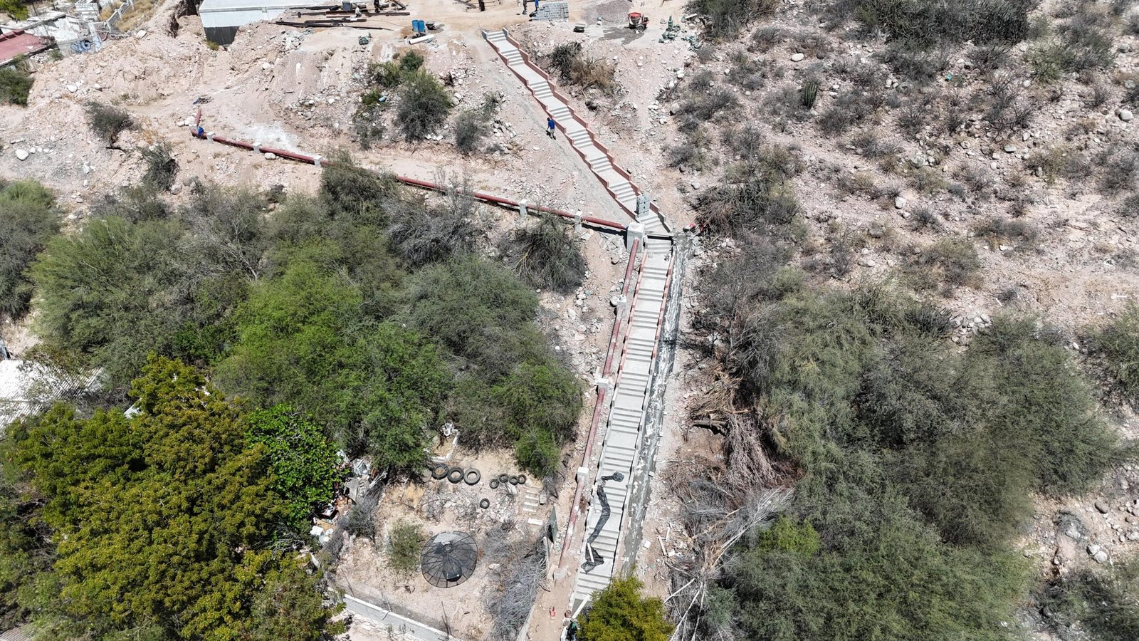 Por su parte, la escalinata presenta un avance del 80%, lo que servirá para conectar las colonias ubicadas en la parte baja del cerro con el nuevo parque. A la fecha, ya se realizaron los trabajos de colado de escaleras y gran parte de su estructura, encontrándose en proceso las etapas finales, entre ellas la instalación del sistema de alumbrado público con la colocación de postes y luminarias.