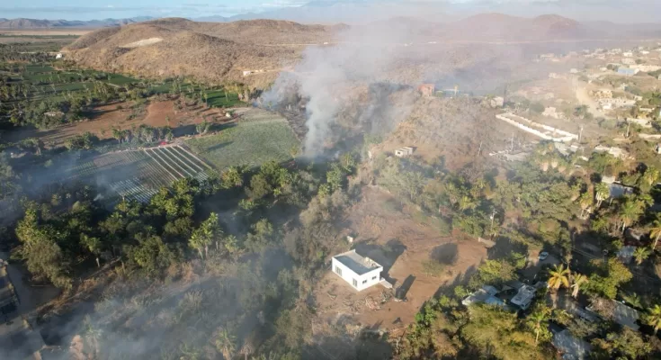 Luego de más de once horas de trabajos para mitigar el incendio generado en una zona de huertas ubicadas en la entrada al poblado de Todos Santos, bomberos municipales en coordinación con elementos de Protección Civil Estatal, Secretaria de Defensa Nacional, Marina, Guardia Nacional y Policía Estatal consiguieron sofocar las llamas que se propagaron rápidamente por hasta cuatro hectáreas, informó el subcomandante del Cuerpo de Bomberos de La Paz, Juan Jesús Ruiz Redona.