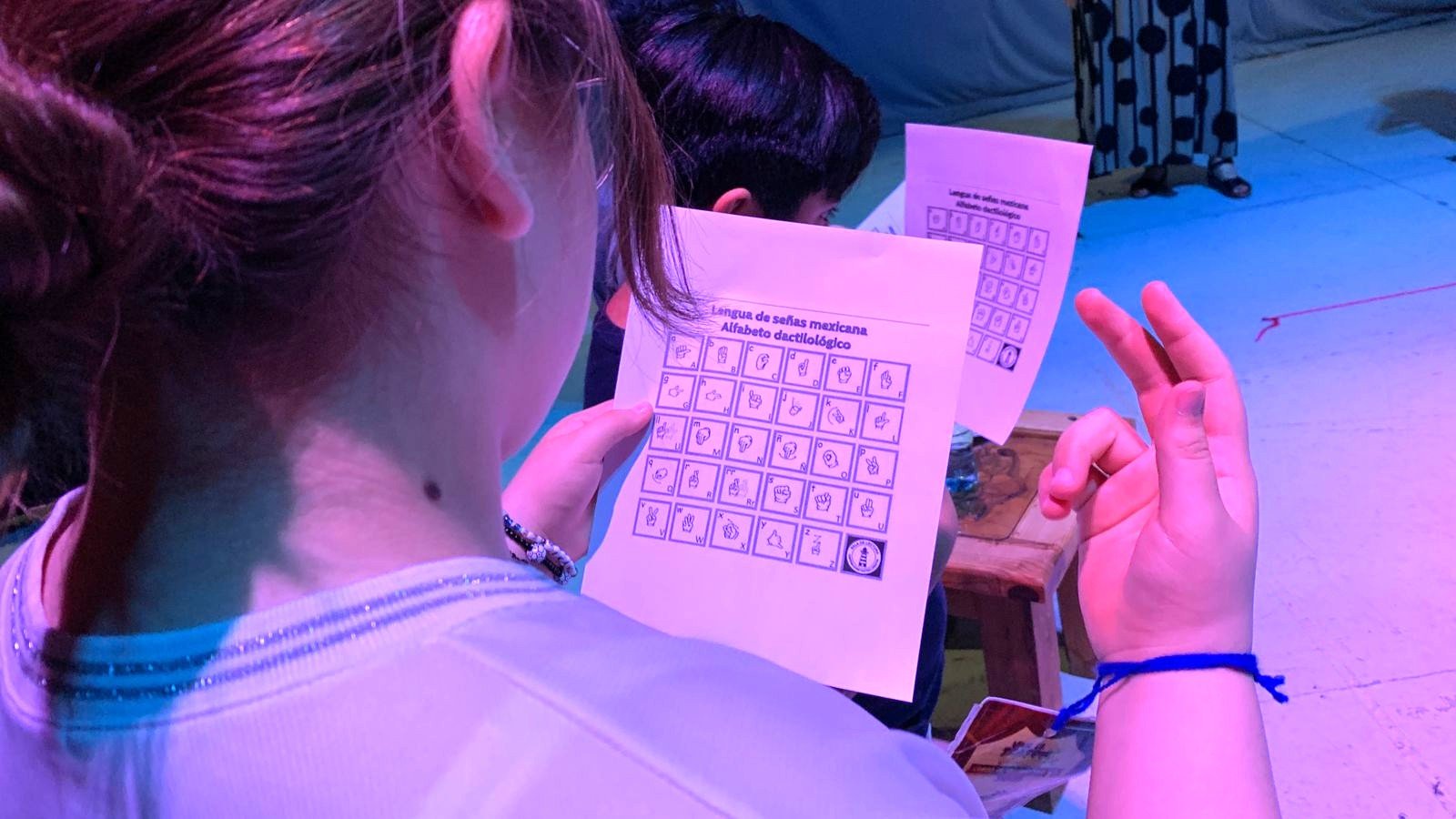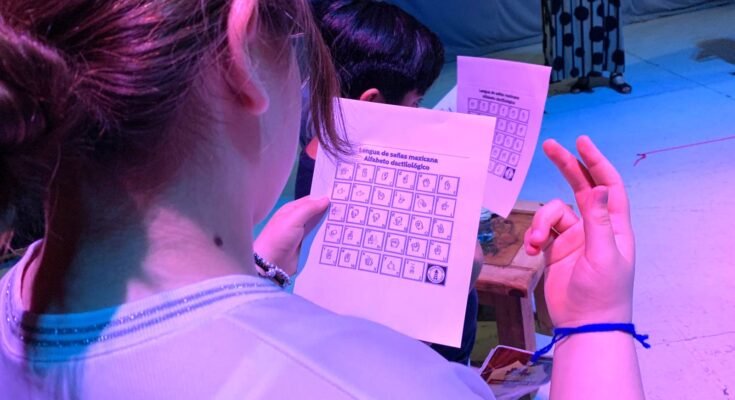 La actividad se realizó en el Teatro Juárez con la participación de niñas, niños y adolescentes de entre 6 y 12 años, donde aprendieron a saludar y usar expresiones básicas como “mamá”, “papá”, “buenos días”, “gracias” y “de nada”. Al finalizar, Chiquetts les enseñó cómo decir “La Paz es inclusión” en Lengua de Señas Mexicanas.