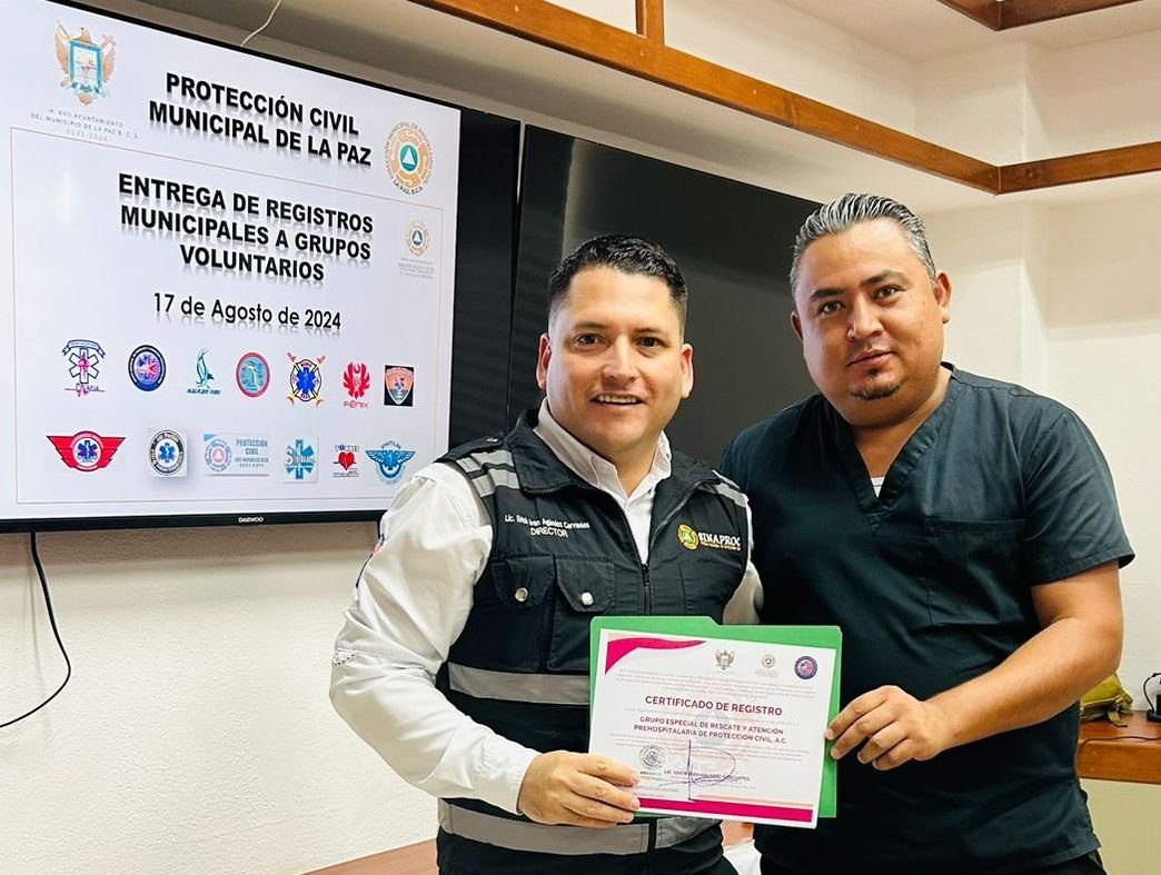 Las agrupaciones que recibieron su certificación son: Grupo Especial de Rescate y Atención Prehospitalaria de Protección Civil A.C., Grupo Voluntario Calafia, Bomberos Veteranos Voluntarios de El Centenario A.C., Ambulance Projects of Lives in Support of Lupita Cosío Barrera, Grupo Sierra A.C., Grupo Voluntario Fénix A.C., Bomberos Voluntarios de El Pescadero, Grupo Voluntario Cimarrones de Baja Sur A.C., Grupo Voluntario EBRE, Grupo Voluntario E.M.S., Grupo Voluntario P.H.T.L.M., Grupo Voluntario Halkon Fire, Grupo Voluntario ASAMP, Grupo Voluntario Valle de Los Planes, Grupo Voluntario de Los Barriles y Grupo Voluntario de Las Pocitas.
