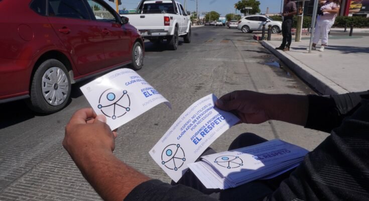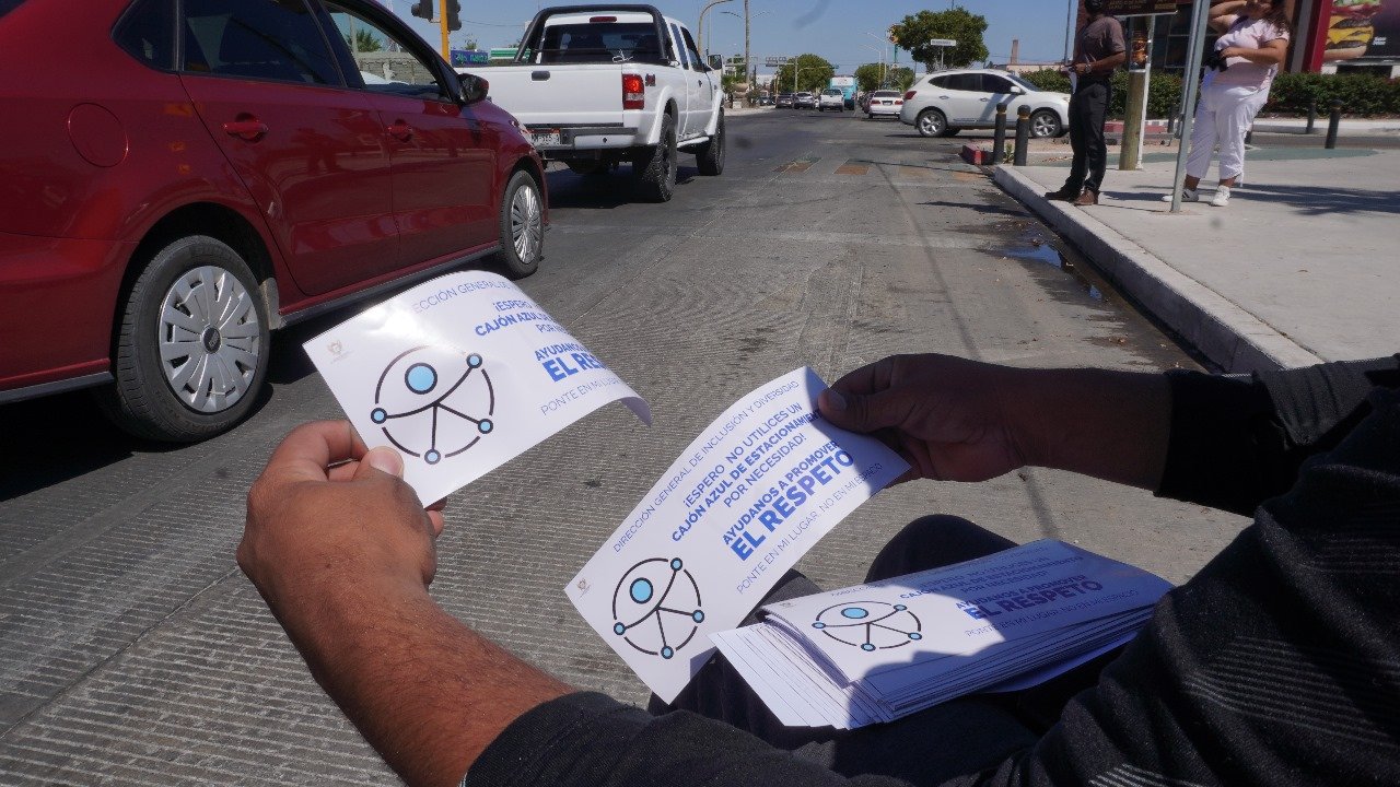 La actividad se llevó a cabo en el crucero de las calles 5 de Febrero y bulevar Agustín Olachea, como parte de la campaña permanente de concientización “Ponte en mi lugar, no en mi espacio”, informó la encargada de Despacho de la Dirección Municipal de Inclusión, Raquel Guízar Gómez.