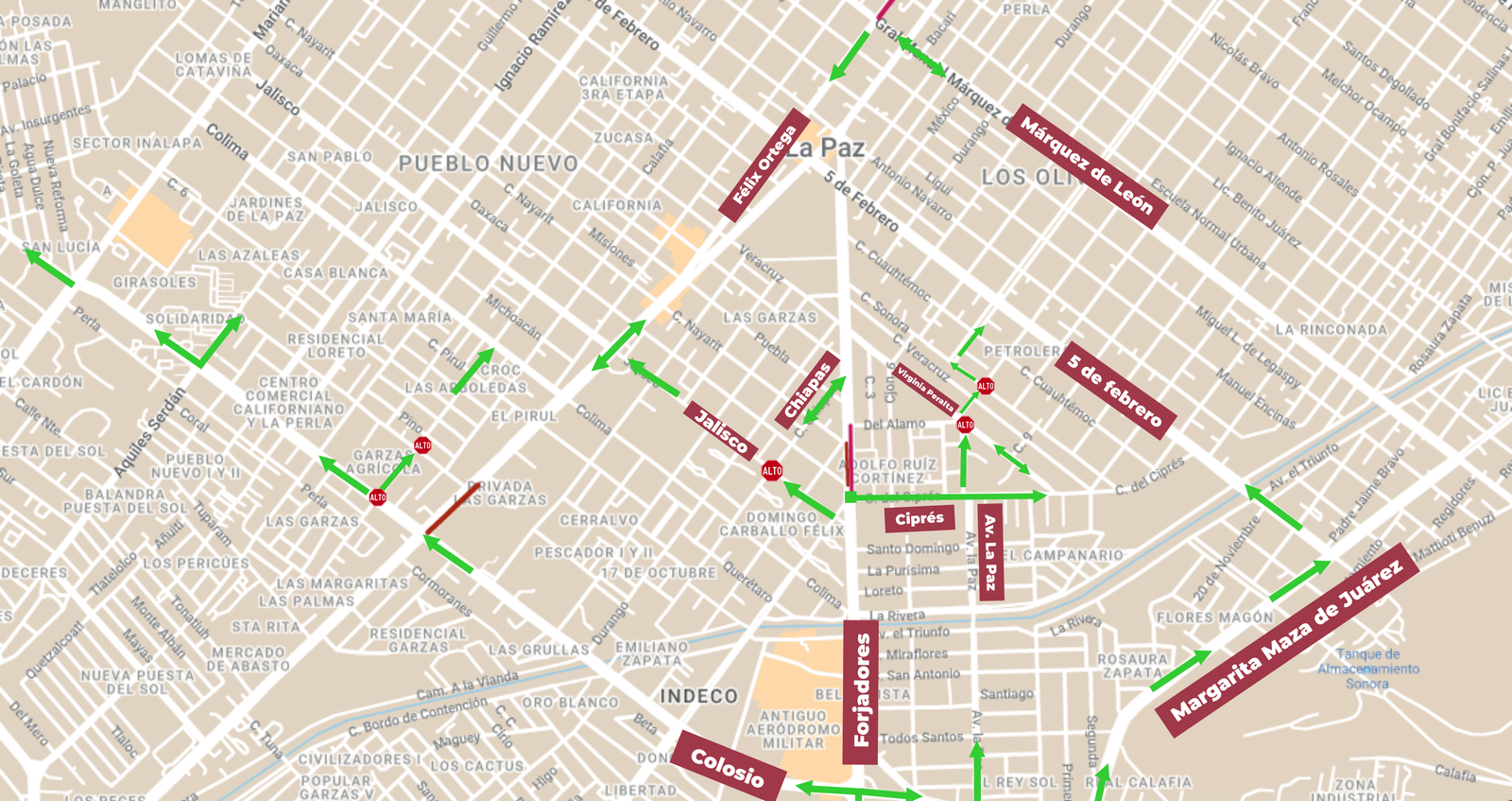 - Por acuerdo con la Dirección de Seguridad y Tránsito Municipal de La Paz se implementarán 4 altos en los cruceros de Chiapas y Jalisco, Galeana y Sonora, Virginia Peralta y avenida La Paz; se abrirá temporalmente el camellón de Forjadores y Chiapas, para la continuidad del tráfico.