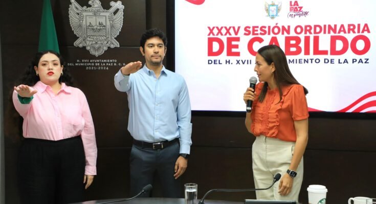 En sesión ordinaria de Cabildo del Ayuntamiento de La Paz, la Alcaldesa, Milena Quiroga Romero, tomó protesta a quienes asumirán las responsabilidades de la Dirección General del Instituto Municipal de las Mujeres y de la Tesorería Municipal, Christa González Robinson y Jassiel Enríquez Varela, respectivamente.