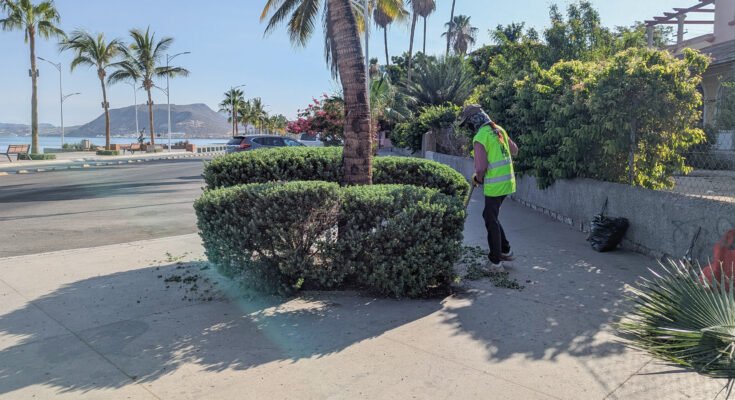 La Dirección General de Servicios Públicos Municipales llevó a cabo trabajos de mantenimiento en el malecón de La Paz, donde se atendieron un total de 260 arbustos y 26 palmeras con labores de poda baja, concluyendo en la calle Juan María de Salvatierra.