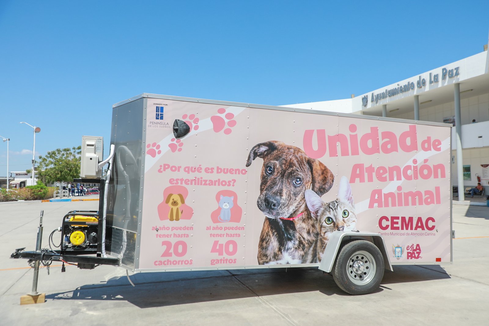 Durante la ceremonia de honores a la bandera realizada en la explanada del Palacio Municipal, la Alcaldesa Milena Quiroga Romero recibió a nombre del Ayuntamiento de La Paz, una Unidad de Atención Móvil para mascotas, donada por la Sociedad Mercantil Península de los Sueños, que será destinada al Centro Municipal de Atención Canina para realizar jornadas de esterilización de perros y gatos en situación de calle.