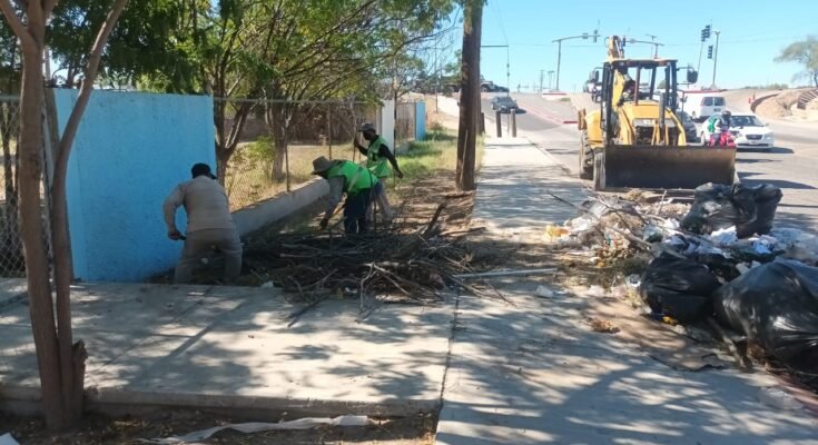 Posteriormente, como parte de estas labores, personal operativo apoyado con maquinaria pesada realizó el levantamiento de más de 600 toneladas de tierra, ramas y basura acumulada en diferentes zonas de la ciudad, principalmente en bulevares como Forjadores, Agustín Olachea y Padre Kino, así como en parques y panteones municipales.
