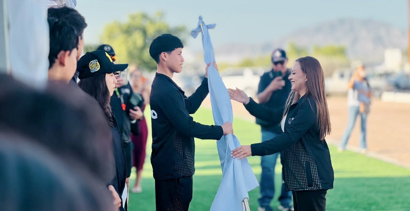 Reunidos los 322 deportistas de las 17 disciplinas que participarán en dicha justa deportiva, así como padres de familia y funcionarios del Ayuntamiento, Paz Ochoa hizo entrega de la bandera con el escudo oficial municipal a Oscar Isaac Zárate Romero, orgullosa de contar con los mejores representantes del deporte loretano.