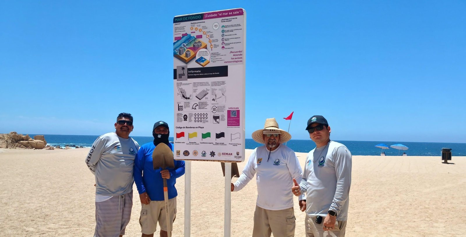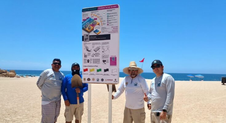 Con el compromiso del XV Ayuntamiento de Los Cabos que preside Christian Agúndez Gómez, de fortalecer la seguridad y el bienestar de quienes disfrutan de las playas, se realizó la instalación de paletas informativas en diferentes puntos del litoral; estas señalizaciones tienen como objetivo ofrecer recomendaciones claras y accesibles sobre el fenómeno de mar de fondo y el sistema de códigos de banderas que indican las condiciones del mar, ayudando a las y los visitantes a mantenerse informados y seguros.