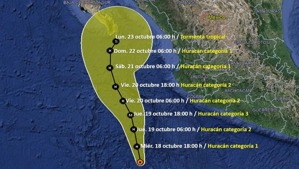’Hasta el momento, el pronóstico del Centro Nacional de Huracanes envía a ‘’Norma’’ a la zona sur de la península de Baja California Sur, por lo que estaría pasando a unos 50-100 kilómetros al sur de nosotros, sin embargo, los efectos podrían ser lluvias fuertes, torrenciales, oleaje elevado de 3 a 4 metros de altura y vientos fuertes, todo dependerá de la intensidad con la que siga avanzando’’, aseveró el subdirector de Protección Civil, Francisco Cota.
