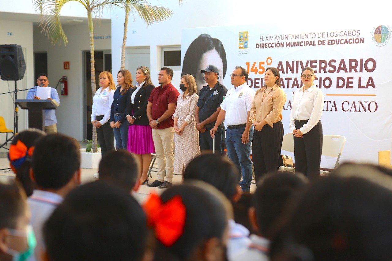 La mañana de este miércoles, el gobierno que preside Oscar Leggs Castro a través de la Dirección Municipal de Educación, llevó a cabo la ceremonia cívica en la que se conmemoró el 145 aniversario del natalicio de la profesora Rosaura Zapata Cano en el colegio Santo Domingo de San José del Cabo, donde participaron personas servidoras públicas, docentes y alumnos de la institución.