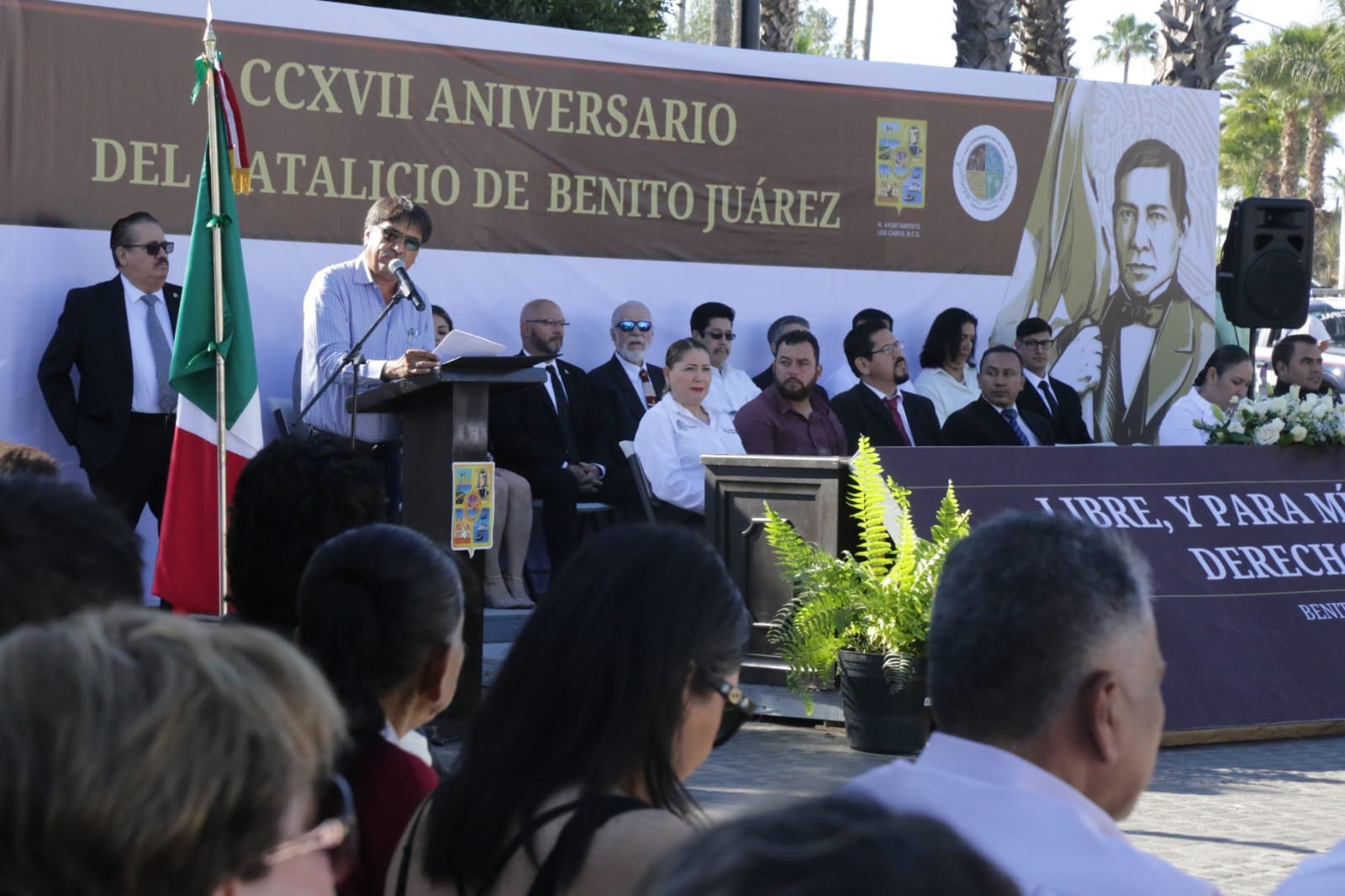 Durante el evento, el presidente municipal de Los Cabos Oscar Leggs Castro, manifestó que el motivo de estar reunidos fue celebrar el natalicio de quien es considerado el mejor presidente en la historia de México, un político y gobernante que sentó las bases del estado moderno mexicano, y que además nos libró para siempre del yugo de las monarquías al derrocar el imperio de Maximiliano de Habsburgo, un hombre que encarnó la 2da transformación con las Leyes de Reforma y que son la base de la ideología de la 4ta transformación a la que se han sumado millones de mexicanos.