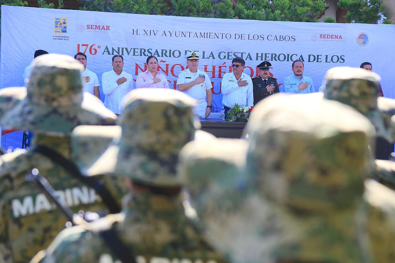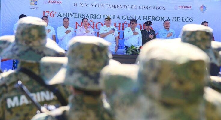 Para conmemorar el 176 Aniversario de la Gesta Heroica de los Niños Héroes de Chapultepec, este miércoles autoridades del Gobierno de Los Cabos encabezadas por el alcalde Oscar Leggs Castro, en conjunto con personal de la Tercera Zona Militar, Secretaría de la Defensa Nacional y estudiantes de nivel básico, realizaron una ceremonia de izamiento y honores a la bandera.