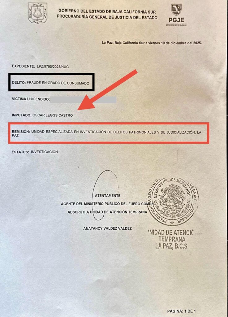 • Se abrió la carpeta de investigación LPZ/9795/2025/NUC en contra del nativo de Migriño por el delito de fraude y lo que resulte.