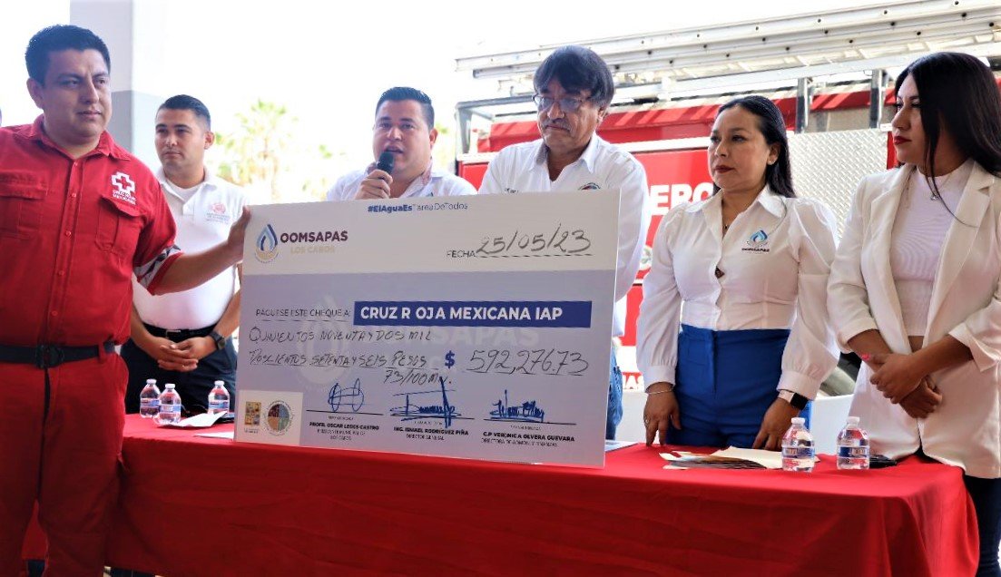 - El alcalde Oscar Leggs Castro junto con el equipo de Agua Potable de Los Cabos entregaron más de un millón de pesos al Cuerpo de Bomberos y a la Cruz Roja Mexicana.