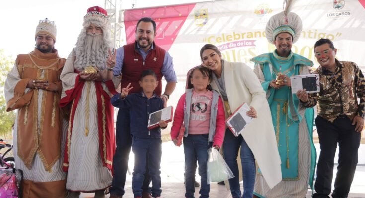 Como parte de las celebraciones del Día de Reyes Magos, el presidente municipal Christian Agúndez Gómez, acompañado de la presidenta honoraria del Sistema DIF Municipal, Sol Delgado Moreno, encabezó el tradicional festejo que se llevó a cabo este sábado en las zonas delegacionales de este municipio, acompañado por cada delegada de la comunidad de La Ribera, Linda Maribel Silva Cosió; en Miraflores, Aremy García García y en Santiago, Aracely Cota Ruíz.