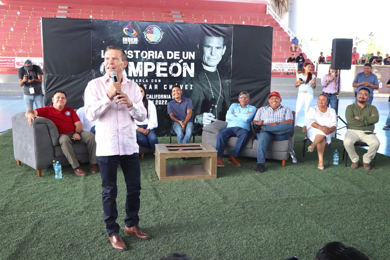 Como parte del compromiso del presidente municipal de Los Cabos Oscar Leggs Castro: apoyar e impulsar el desarrollo del deporte en la niñez y la juventud cabeña, esta mañana el ex campeón mundial de box con títulos mundiales en tres divisiones de peso, Julio César Chávez, dio una plática motivacional en el Auditorio “Leonardo Gastelum” de Cabo San Lucas, donde ante jóvenes deportistas, niñas, niños y ciudadanía en general relató su historia dentro del ámbito deportivo, con la finalidad de motivar a las y los jóvenes deportistas que recién empiezan en su profesión deportiva.