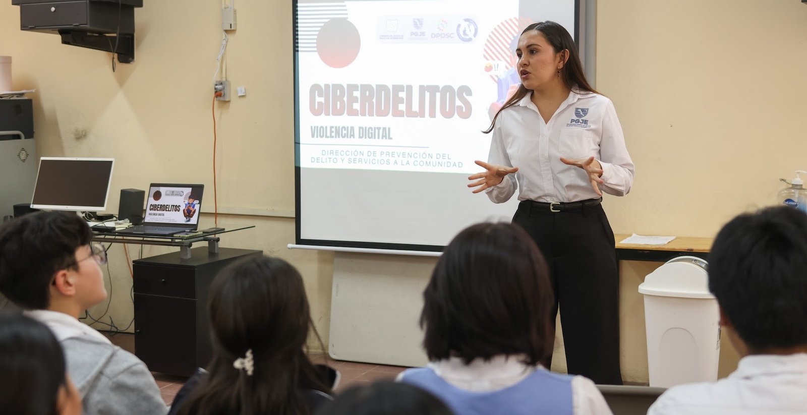 En el conversatorio estuvieron presentes la encargada de despacho de SIPINNA, Bilma Ojeda Martínez; la cuarta regidora y presidenta de la Comisión Edilicia de Niñas, Niños y Adolescentes, Luz Adriana Cosío Urbina; así como el personal especializado de la PGJE quienes de manera dinámica y participativa informaron a un total de 157 alumnas y alumnos sobre qué es el ciberdelito, cómo prevenirlo y cuáles son las instancias a las que pueden acudir en caso de ser víctimas o testigos de alguna situación de riesgo.