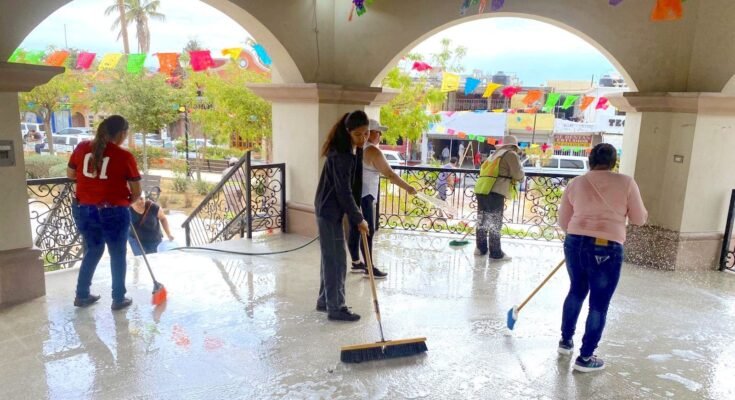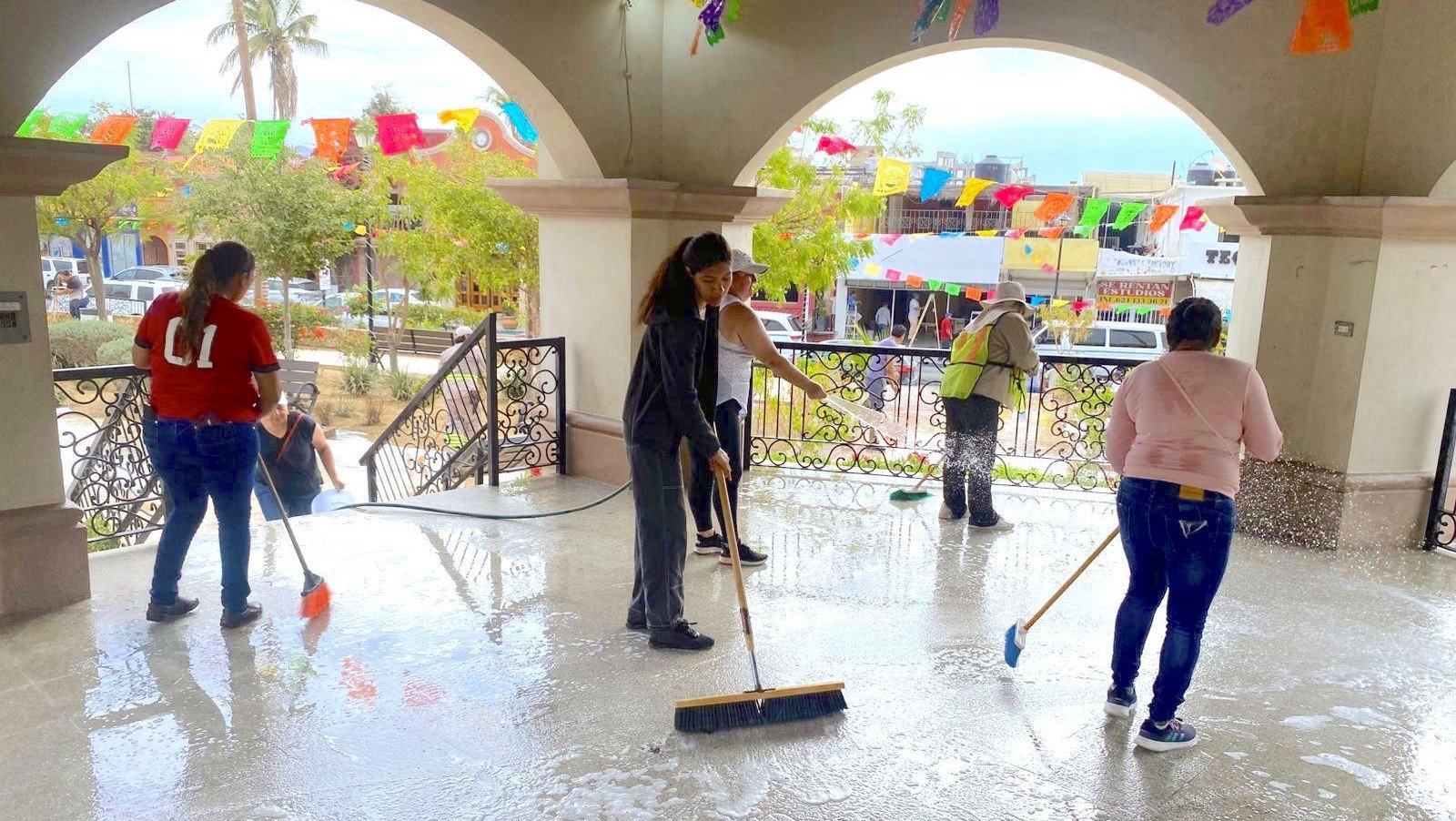 Con el objetivo de mantener en óptimas condiciones el espacio donde se lleva a cabo el programa “Viva la Plaza”, se realizó una jornada de limpieza en la plaza pública “Amelia Wilkes Ceseña”, organizada por la coordinación de Servicios Públicos en Cabo San Lucas en conjunto con el Comité Organizador del evento y con la participación de locatarios del centro histórico.