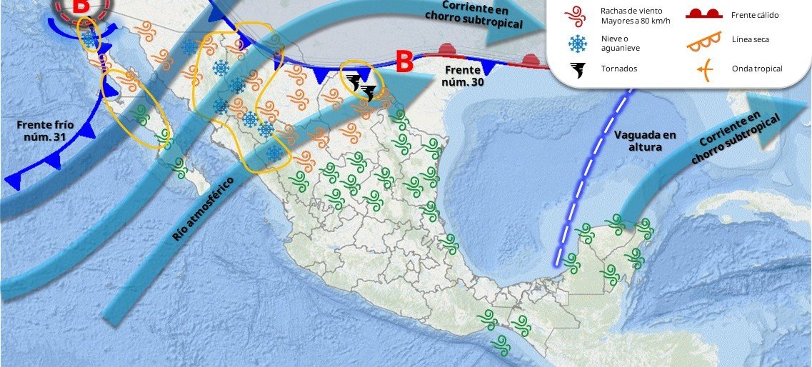 Detalló, que lo anterior será originado por la presencia de una circulación ciclónica que estará interactuando con los frentes fríos 30 y 31, así como corrientes en chorro polar y subtropical, lo cual dará origen a la tercera Tormenta Invernal de la temporada.