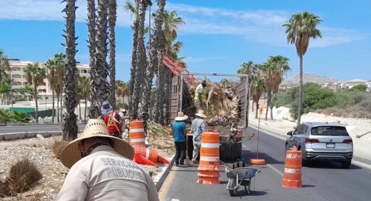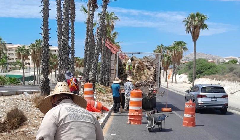 Personal de la Dirección General de Servicios Públicos, a través de la Dirección de Aseo y Limpia, continúa trabajando activamente en la limpieza y poda de palmeras de la zona hotelera del municipio.