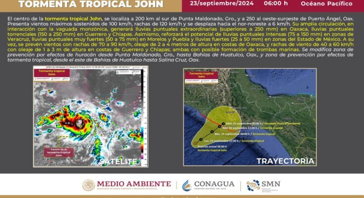 Además, la tormenta tropical “John” se localiza a 200 km al sur de Punta Maldonado, Guerrero, y a 245 km oeste-suroeste de Puerto Ángel, Oaxaca, moviéndose al nor-noreste a una velocidad de 6 kilómetros por hora.