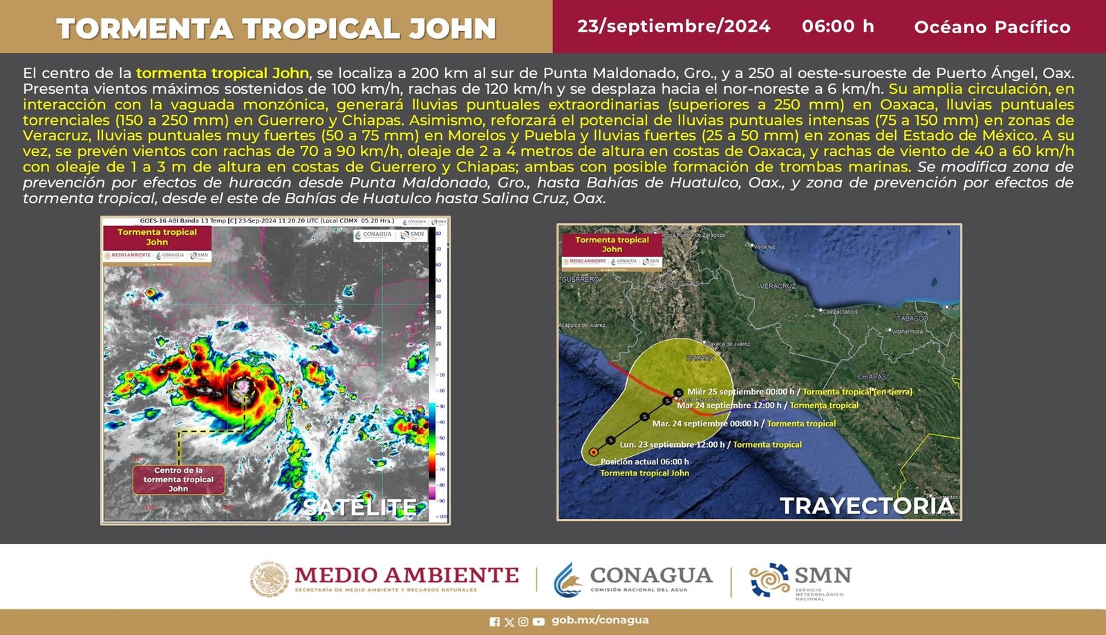 Además, la tormenta tropical “John” se localiza a 200 km al sur de Punta Maldonado, Guerrero, y a 245 km oeste-suroeste de Puerto Ángel, Oaxaca, moviéndose al nor-noreste a una velocidad de 6 kilómetros por hora.