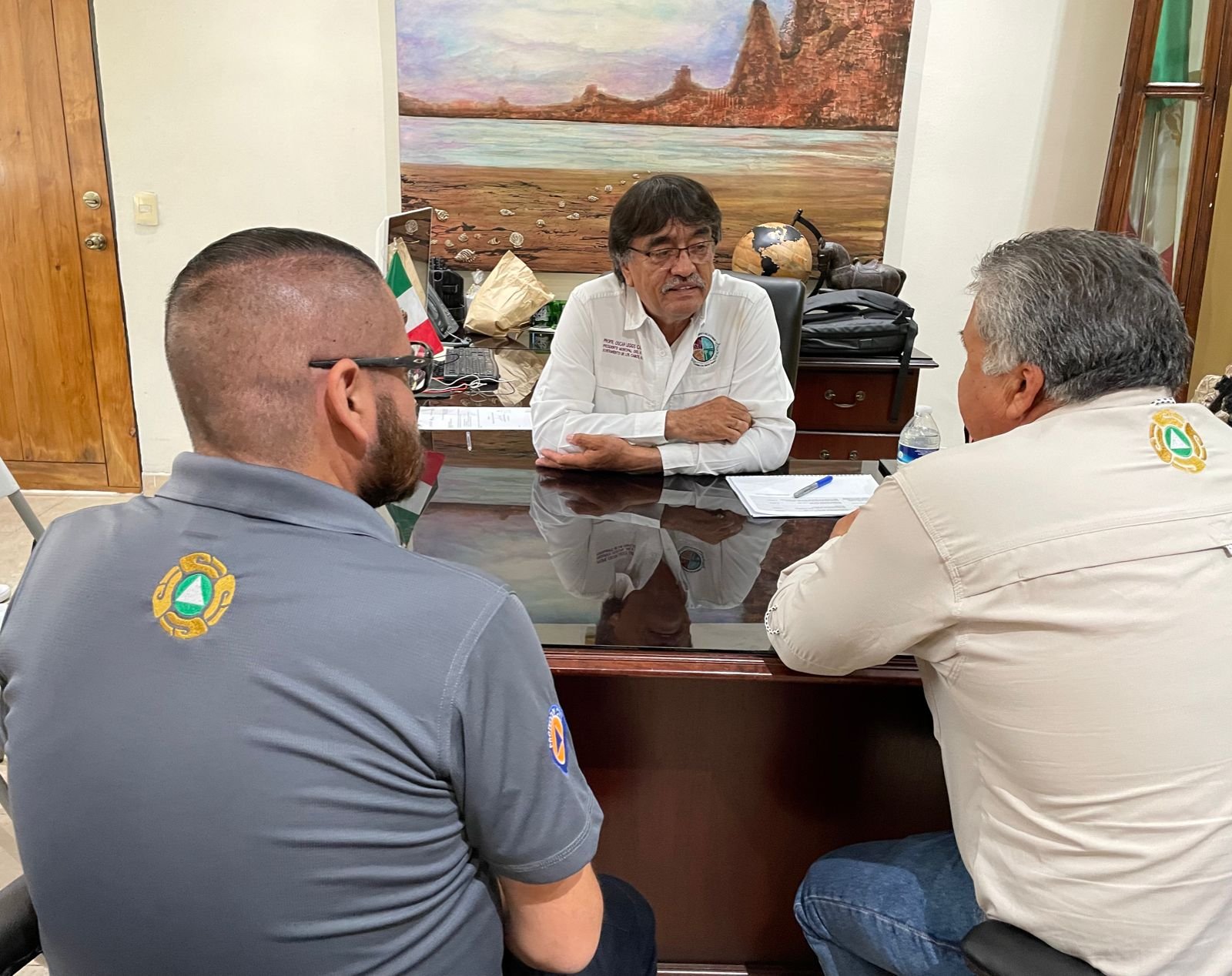 En una reunión que sostuvo el presidente municipal Oscar Leggs Castro, con el subsecretario estatal de Protección Civil Benjamín García Meza, se acordó que el próximo lunes 22 del presente mes, se llevará a cabo en la ciudad de La Paz la instalación del Consejo de Protección Civil y de manera simultánea vía zoom en todos los municipios de Baja California Sur, esto con la finalidad de que quienes integran dicho Consejo estén activos ante la llegada de un fenómeno hidrometereológico.