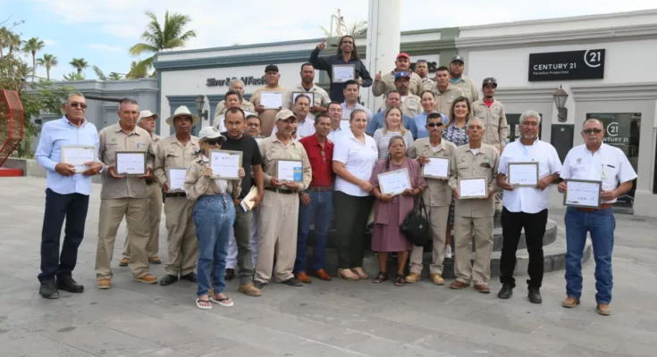 En el marco del acto cívico de honores a la bandera celebrado este lunes 06 de noviembre en la explanada del Palacio Municipal, en San José del Cabo, el XIV Ayuntamiento que preside Oscar Leggs Castro, en coordinación con el Sindicato de Burócratas encabezado por Marisela Montaño Peralta, realizó la entrega de reconocimientos al personal sindicalizado de la Dirección General de Servicios Públicos Municipales, con más de 20 años de trayectoria en la Administración Pública.