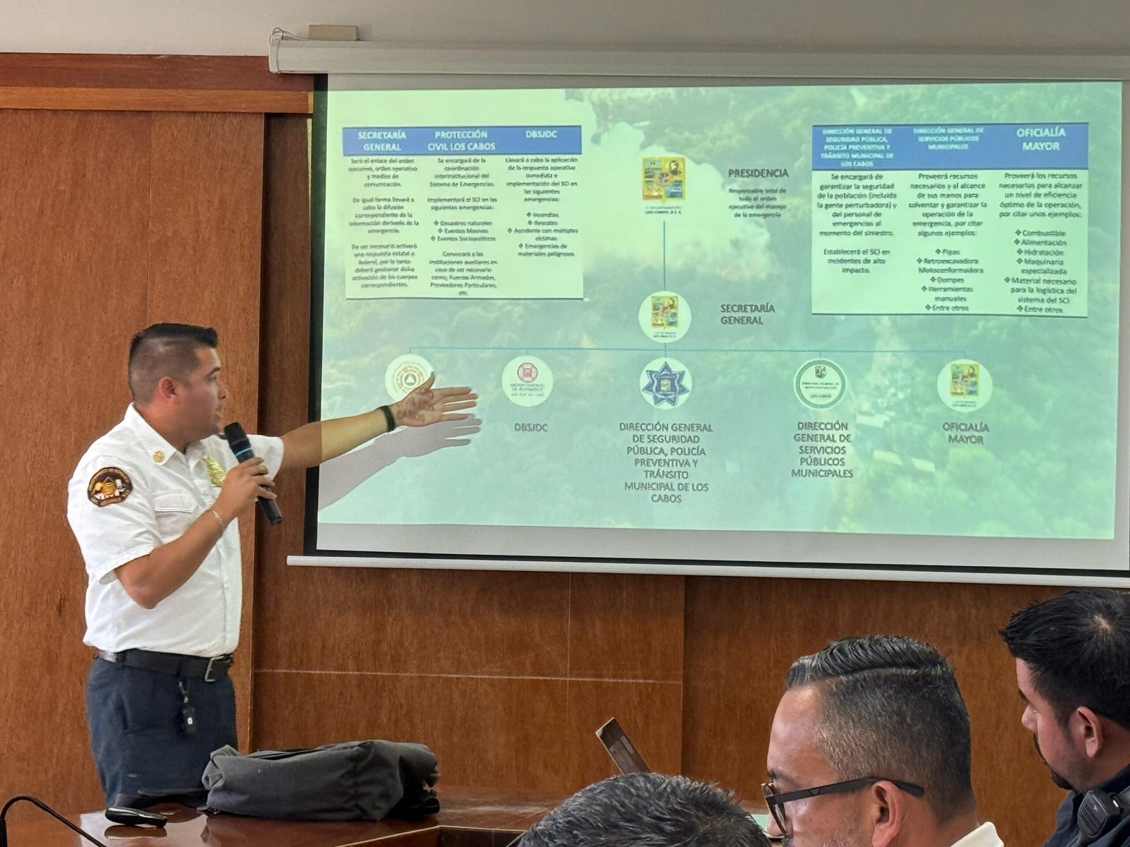 Para garantizar una respuesta eficiente ante emergencias de gran escala, se llevó a cabo una mesa de trabajo encabezada por el secretario general del Ayuntamiento de Los Cabos, Alberto Rentería Santana, en la que participaron las fuerzas armadas, representantes del Gobierno de Baja California Sur y diversas áreas municipales.