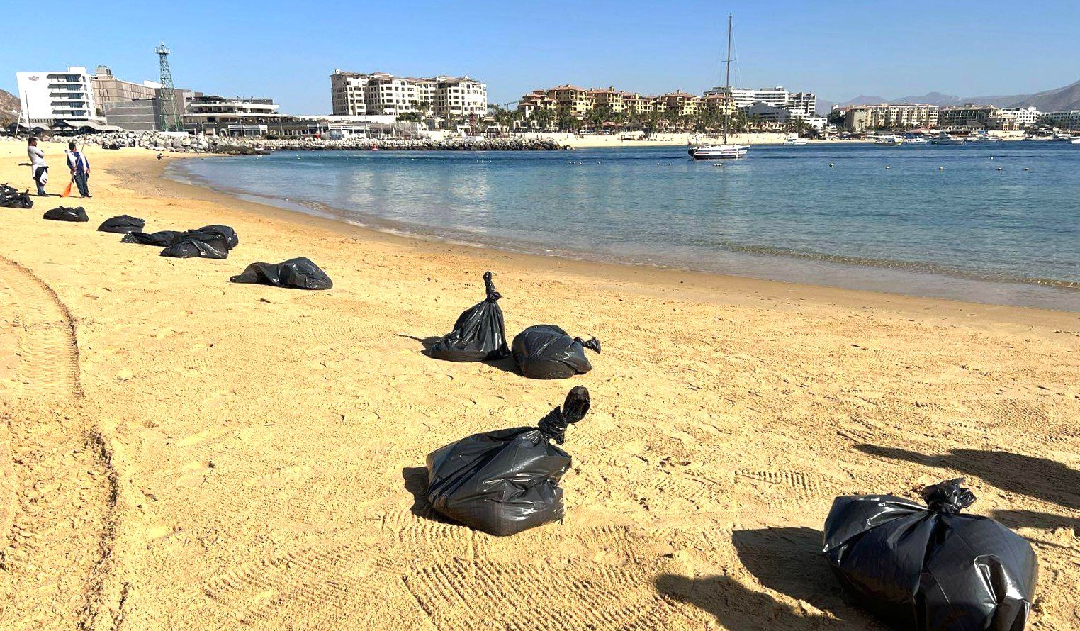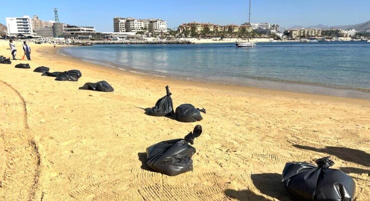 - Personal de ZOFEMAT llevó a cabo el retiro de aproximadamente 120 bolsas de sardinas que habían quedado varadas en la orilla de la playa El Corsario de Cabo San Lucas