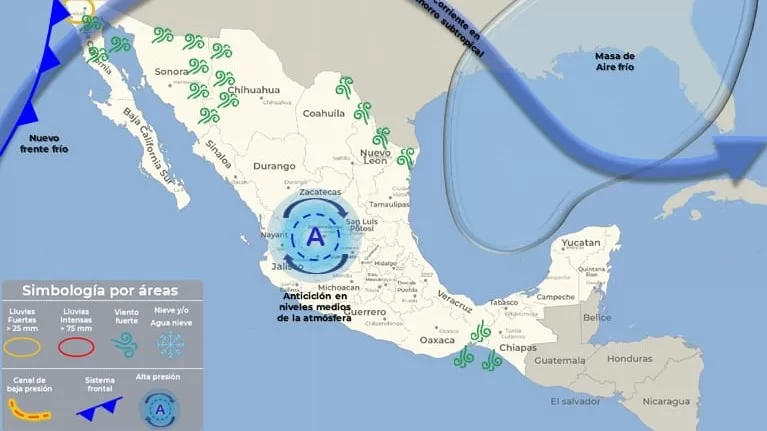Asimismo, el frente frío número 36 ingresó ayer martes por la tarde, afectando el norte y noreste del país, lo que podría generar disminución de las temperaturas, vientos fuertes y lluvias.