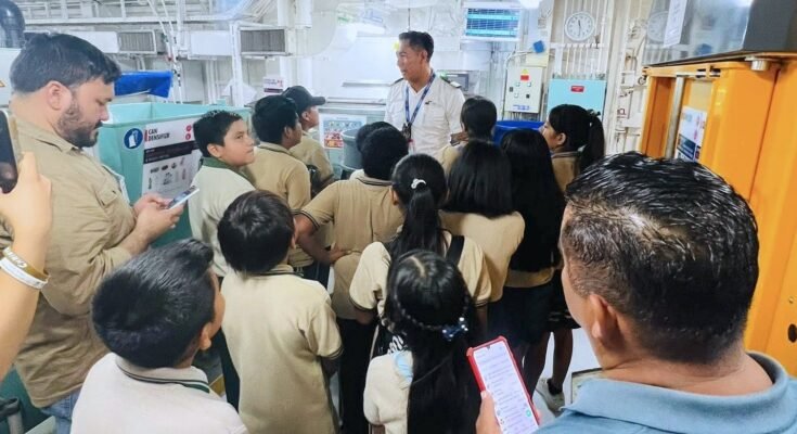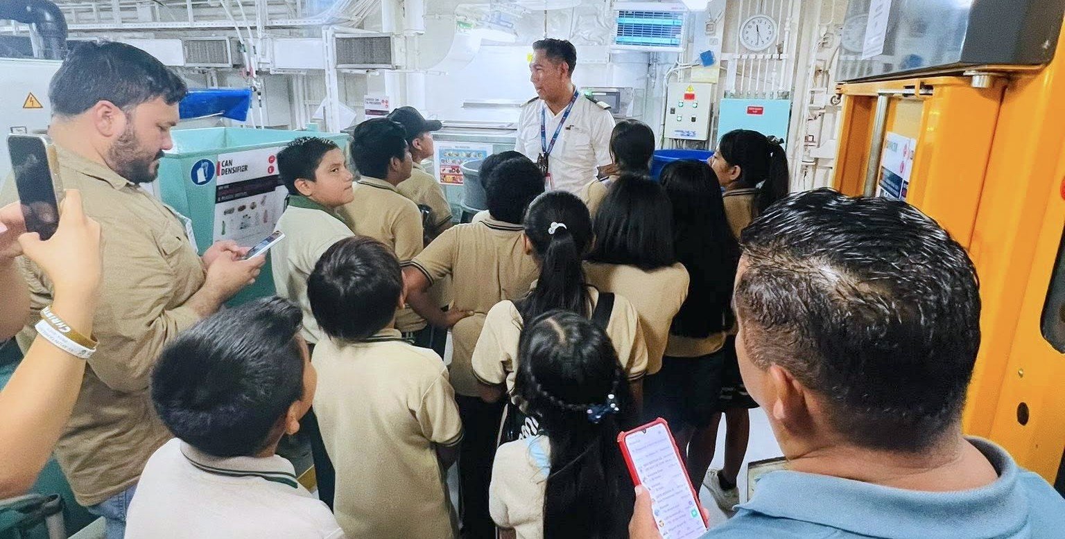 Durante el recorrido, las y los estudiantes tuvieron la oportunidad de conocer el funcionamiento interno del buque, en especial el área de reciclaje y manejo de residuos, donde recibieron una explicación sobre el tratamiento responsable de los desechos y la importancia del aprovechamiento de materiales orgánicos e inorgánicos; asimismo, pudieron observar el sistema biodigestivo con el que el crucero transforma los residuos alimenticios en agua reutilizable, mediante un proceso natural impulsado por bacterias.