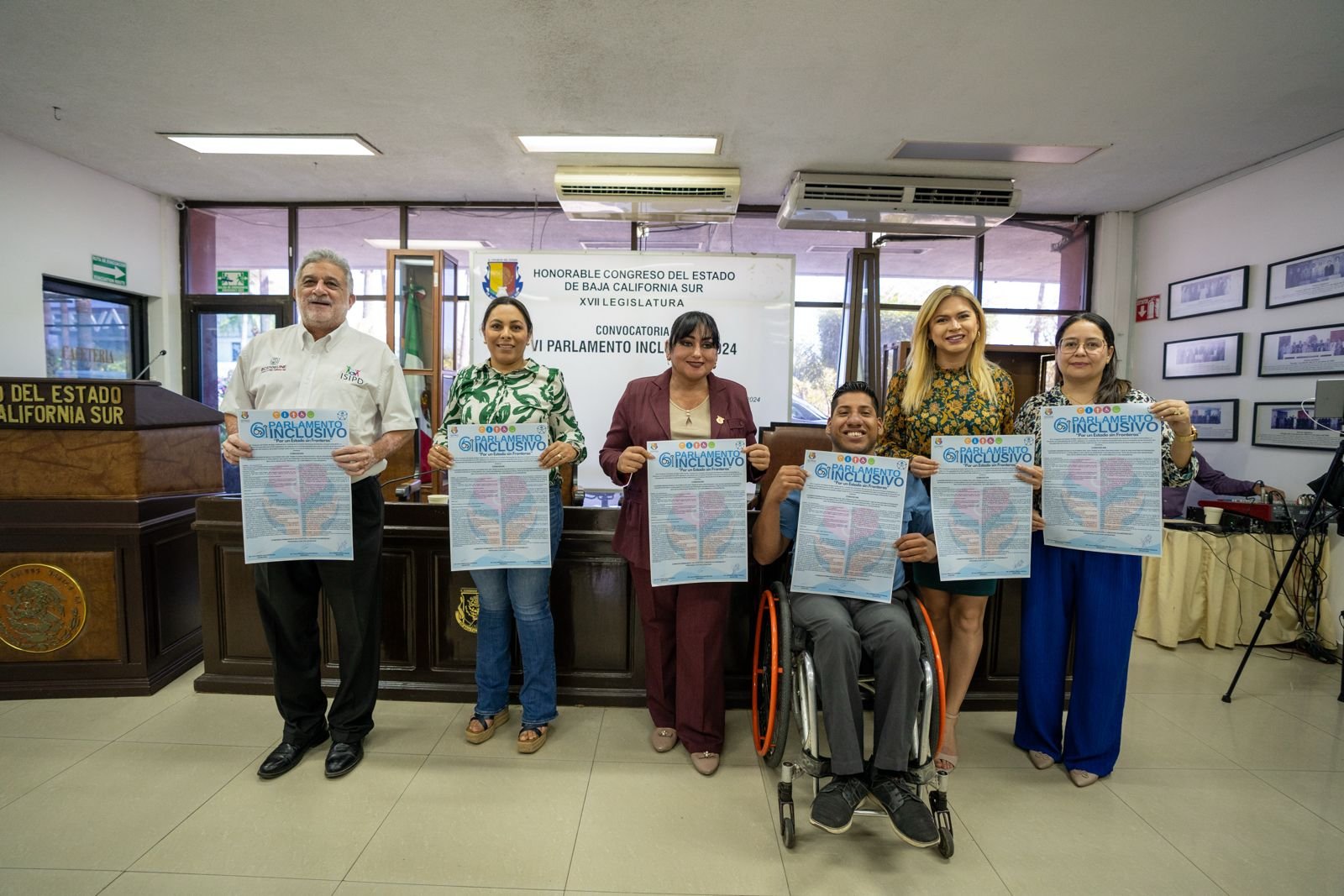 Teniendo como sede la Sala de Comisiones Lic. Armando Aguilar Paniagua del Congreso de Baja California Sur, la Comisión Permanente de Atención a Grupo Vulnerables y a Personas con Discapacidad de la XVII Legislatura, integrada por las diputadas, Dalia Verónica Collins Mendoza, presidenta, Guillermina Díaz Rodríguez, secretaria y Lourdes Cornejo Rendón, secretaria, presentó a medios de comunicación y en general a la sociedad sudcaliforniana las bases de la convocatoria del VI Parlamento Inclusivo de Personas con Discapacidad, “Por un Estado sin Fronteras” 2024.