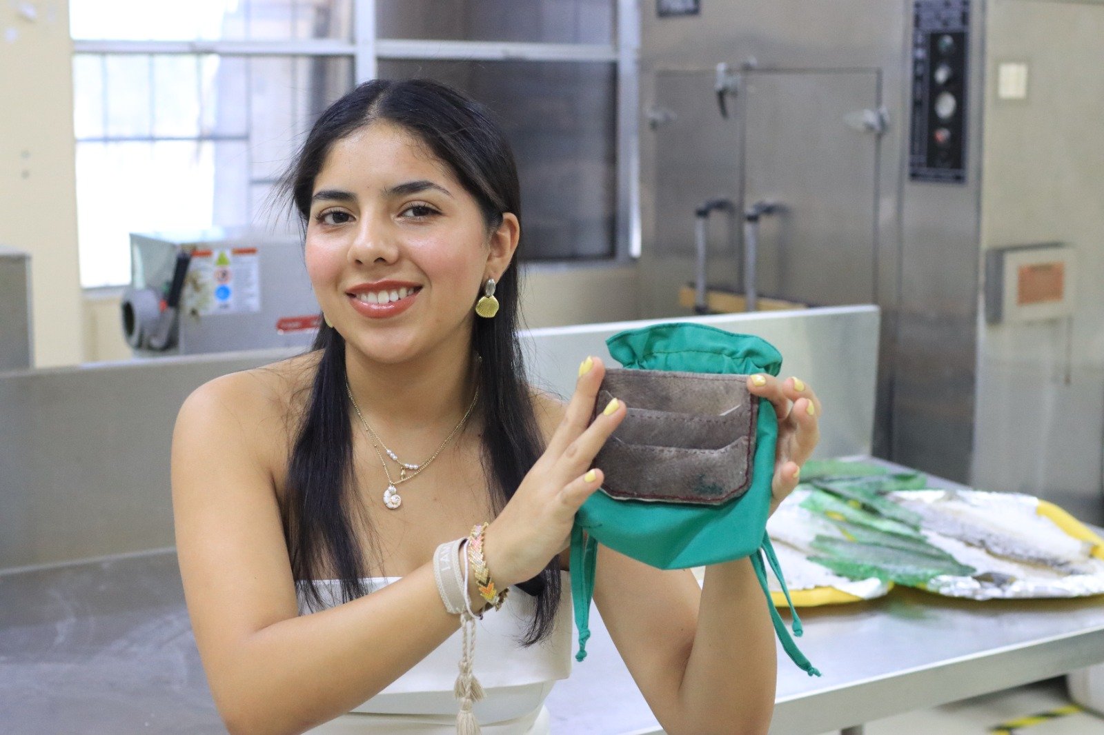 Karla Rodríguez Muñoz, estudiante de la Licenciatura en Bioingeniería en Acuacultura de la Universidad Autónoma de Baja California Sur, desarrolla un innovador proyecto de investigación enfocado en el aprovechamiento de pieles de pescado como materia prima para la elaboración de productos artesanales, tales como carteras, bolsos y cinturones.