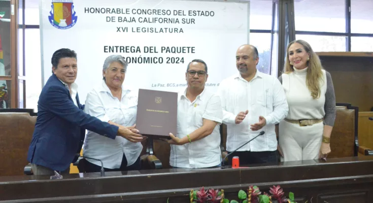 La Mesa Directiva del Congreso de Baja California Sur representada por el diputado Luis Armando Díaz, presidente y la diputada Eda Palacios Márquez, vicepresidenta, así como el presidente de la Comisión Permanente de Asuntos Fiscales, Diputado Enrique Ríos Cruz, recibieron el Paquete Económico del Gobierno del Estado para el ejercicio fiscal 2024.