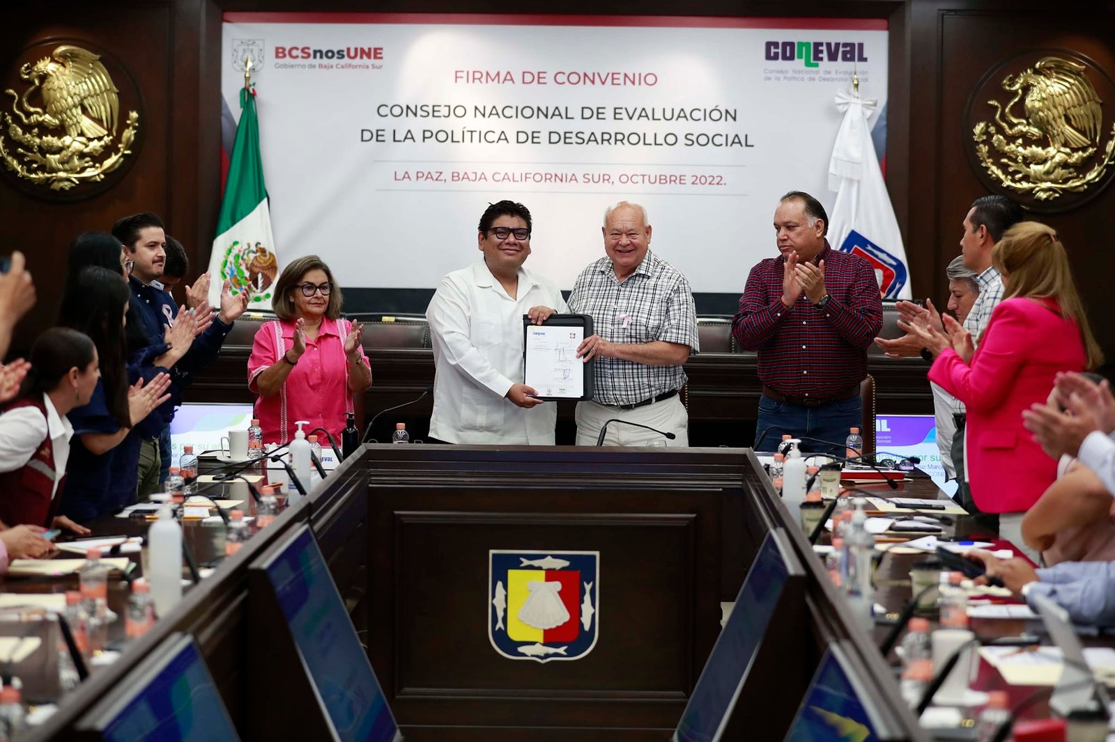 El Gobierno del Estado y el Consejo Nacional de Evaluación de la Política de Desarrollo Social acordaron sumar esfuerzos para aplicar metodologías que permitan a Baja California Sur hacer más eficientes los procesos de indicadores y evaluación de programas, esto mediante la firma de convenio en evento encabezado por el gobernador Víctor Castro Cosío y el secretario ejecutivo de la dependencia, José Nabor Cruz Marcelo.