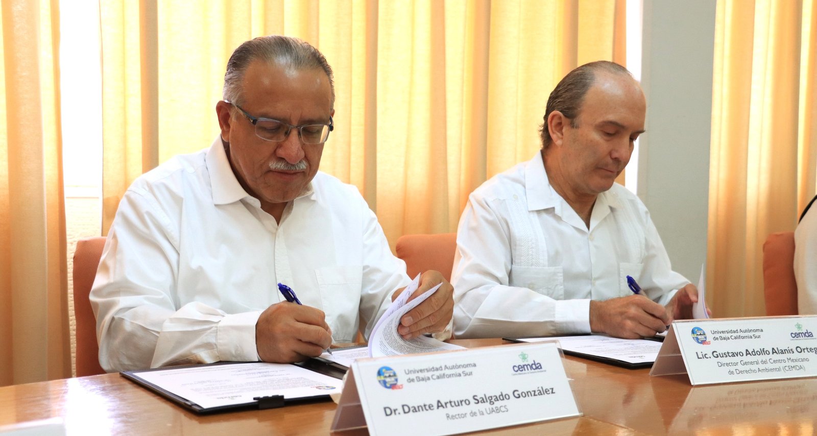 El acuerdo fue signado por el rector de la UABCS, Dante Salgado González, y por el director general del Centro Mexicano de Derecho Ambiental, Gustavo Alanís Ortega. Durante la ceremonia, celebrada en las instalaciones universitarias, estuvieron presentes integrantes del cuerpo directivo y académico de la institución.
