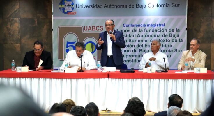 En el marco del inicio de las actividades conmemorativas por el 50 Aniversario de la Universidad Autónoma de Baja California Sur, se llevó a cabo la conferencia magistral titulada “A 50 años de la fundación de la UABCS en el contexto de la creación del Estado libre y soberano de Baja California Sur y la promulgación de su Constitución Política”, un espacio de reflexión histórica que permitió dimensionar la trascendencia de la institución en el devenir social, político y cultural de la entidad.