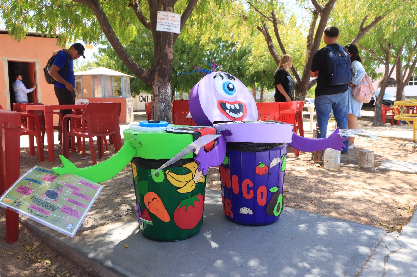 Como parte del proyecto, el equipo elaboró de manera manual dos contenedores de acopio de residuos orgánicos, ubicados en la explanada del Sindicato del Personal Académico de la UABCS. Estos dispositivos, diseñados como “monstruos” dinámicos, buscan atraer la atención de la comunidad universitaria e incentivar la correcta disposición de desechos orgánicos.