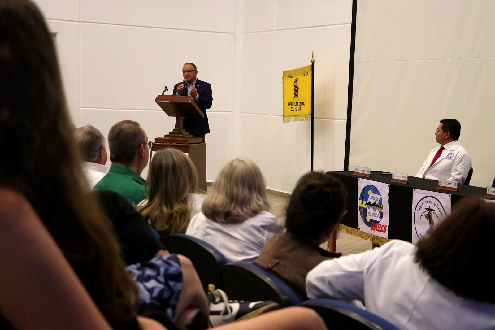 Acompañando al rector estuvo el Dr. José Efraín Torres Valdos, presidente de la Sección Colegiada La Paz del Colegio de Médicos Cirujanos de BCS, quien habló del trabajo que vienen realizando como asociación para fortalecer el desarrollo profesional de sus agremiados.