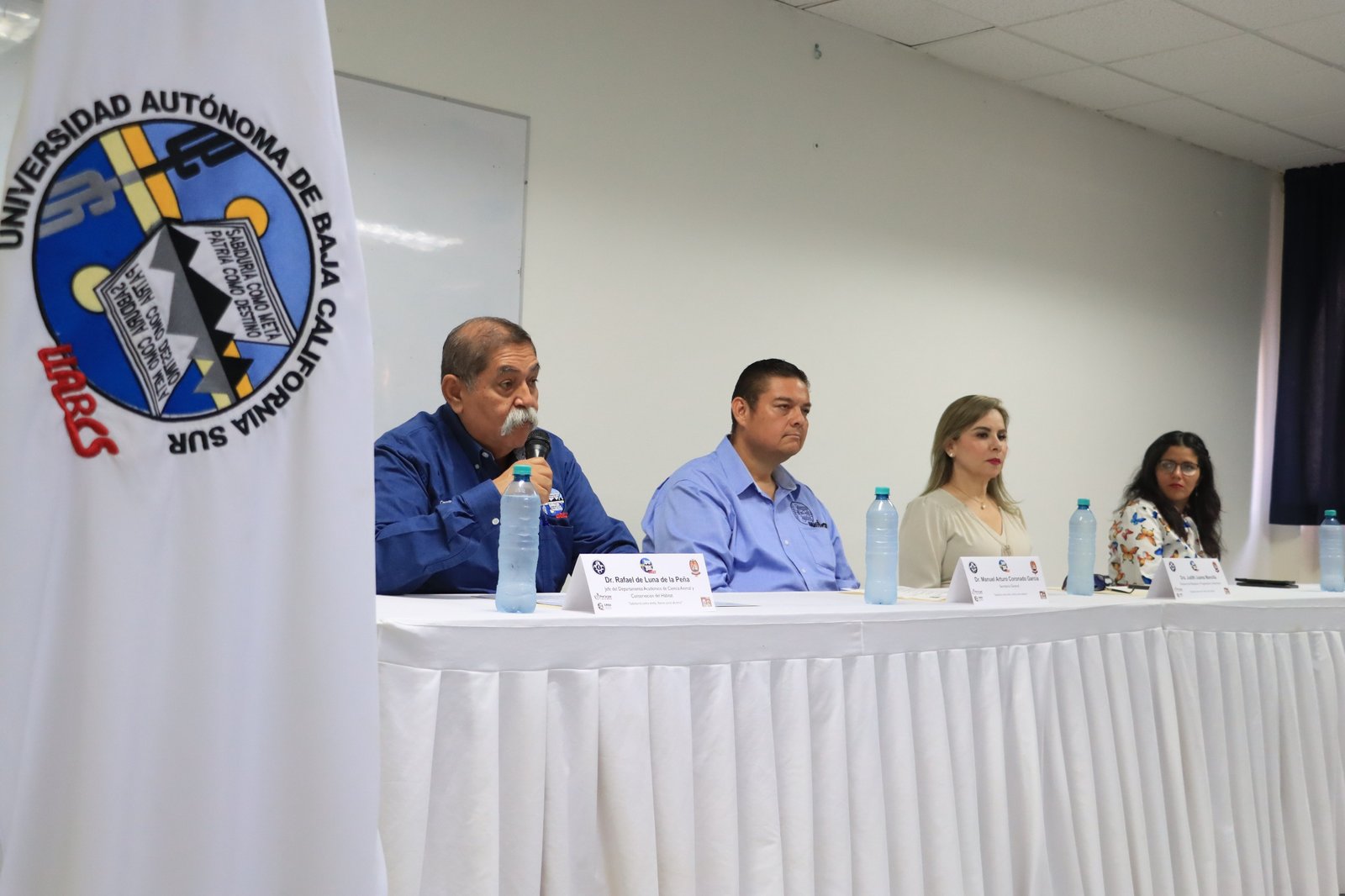 El presídium estuvo integrado por el Dr. Manuel Arturo Coronado García, Secretario General de la UABCS, en representación del rector, Dr. Dante Arturo Salgado González; la Dra. Judith Juárez Mancilla, Directora de Planeación y Programación Universitaria; la Dra. Ariadna Ávila García, responsable de la CRSU; y el Dr. Rafael de Luna de la Peña, jefe del Departamento Académico de Ciencia Animal y Conservación del Hábitat.