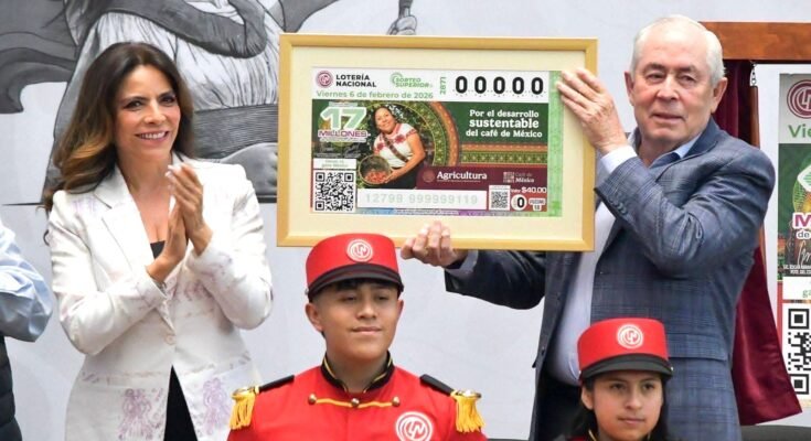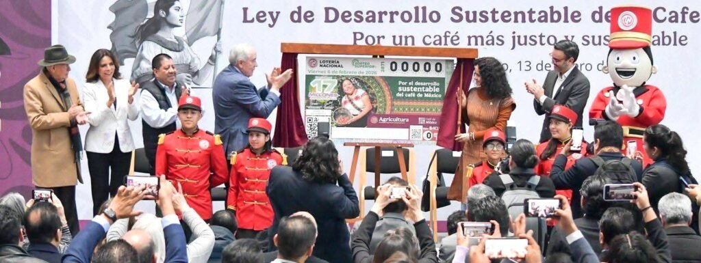 El Subsecretario de Agricultura y Desarrollo Rural, Leonel Cota Montaño, en representación del Gobierno de la República, develó un billete especial de la Lotería Nacional alusivo a un reconocimiento institucional al trabajo y dignidad de las comunidades cafetaleras, las cuáles quedarán protegidas en la nueva “Ley de Desarrollo Sustentable de la Cafeticultura”, que entrará en vigor en junio de 2026 para fortalecer de manera estructural a toda la cadena productiva del café.