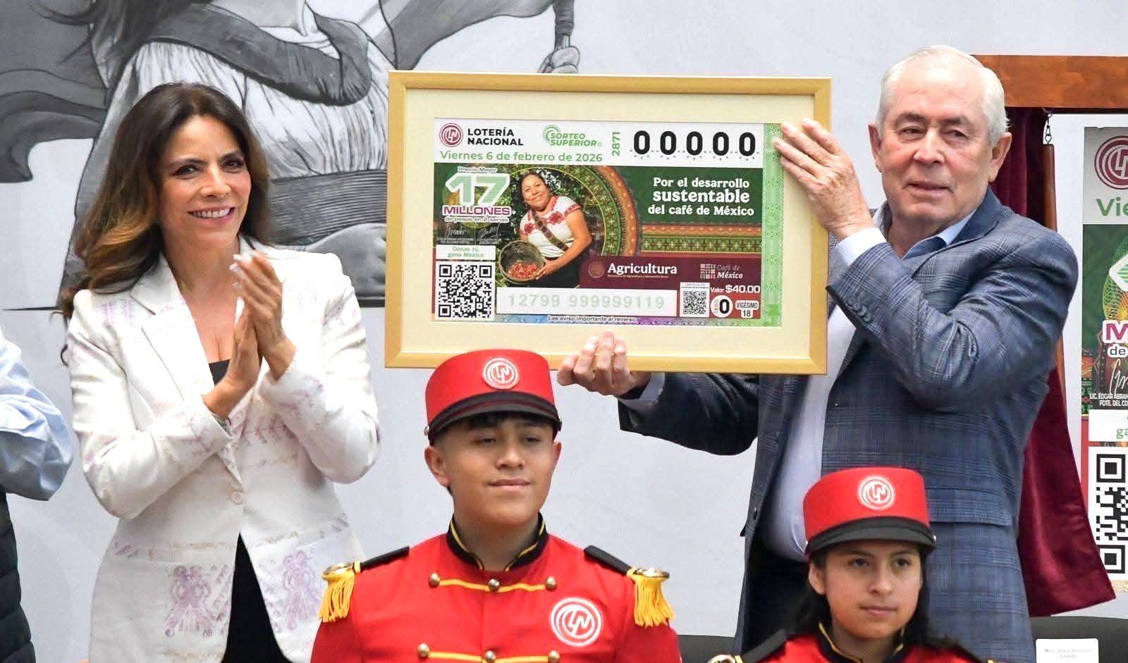 El Subsecretario de Agricultura y Desarrollo Rural, Leonel Cota Montaño, en representación del Gobierno de la República, develó un billete especial de la Lotería Nacional alusivo a un reconocimiento institucional al trabajo y dignidad de las comunidades cafetaleras, las cuáles quedarán protegidas en la nueva “Ley de Desarrollo Sustentable de la Cafeticultura”, que entrará en vigor en junio de 2026 para fortalecer de manera estructural a toda la cadena productiva del café.